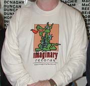 T-shirt is available in natural, sand, or graphite; short sleeve is $15.00, long sleeve $20.00 postpaid. Sweatshirts also available, in natural or grey, $30.00. It has the colourful dragon logo on the front, and our slogan "serving the known universe since 1982" on the back. Send cash, check or money order with color and size preference to Imaginary Records, PO Box 66, Whites Creek, TN 37189 USA and yours will be on its way to grace your impeccable wardrobe. See the accessories page for what's in stock right now. A more shapely model volunteer will get a refund in exchange for a good photo modeling the shirt! |
