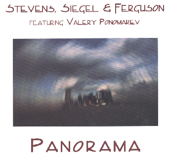 Stevens, Siegel & Ferguson "Panorama" featuring Valery Ponomarev The third CD from the trio, with a twist--the addition of phenomenal trumpeter Valery Ponomarev, with whom they have performed many times on the road. Early in Valery's career, he worked with the Art Blakey group; when he left, it took Wynton Marsalis to take his place... recorded 20-21 March 1998, released 12 Jan 1999. CD only, US list $16.98. Produced by Stevens, Siegel & Ferguson and Valery Ponomarev. Imaginary Records IMX-010 / UPC 8074100102. |