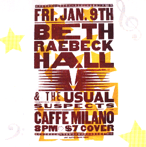 Beth Raebeck Hall & The Usual Suspects "Live At Caffé Milano" 2003 Grammy nominee CD, best contemporary blues category! A live recording on 9 January 1997 at Nashville's Caffé Milano, this was unreleased until 2003. An all-originals set filled with groovy, bluesy improvisation and superb musicianship. One funky chick! (quote, Rocco Prestia of Tower Of Power) CD only. US list $16.98 Crazy Rae CRM 40302 / UPC 783707699622 |